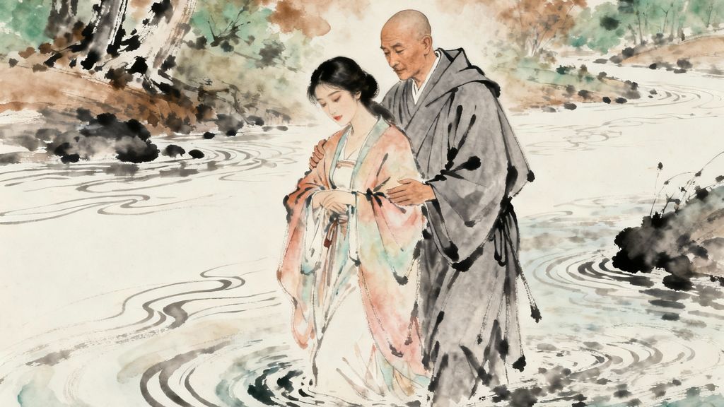 Dwóch pielgrzymujących mnichów dotarło do brzegu rzeki. Ujrzało tam młodą, pięknie ubraną kobietę, która najwyraźniej nie wiedziała, co począć.